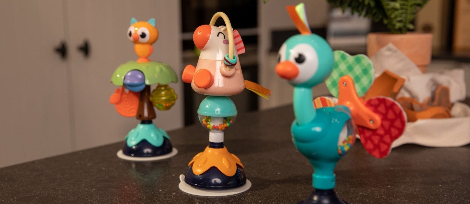 plastové hračky majú veľkú prísavku, pomocou ktorej sa pripevnia k jedálenskému pultíku, a tým sa zabráni tomu, aby ju Vaše dieťatko hádzalo na zem.