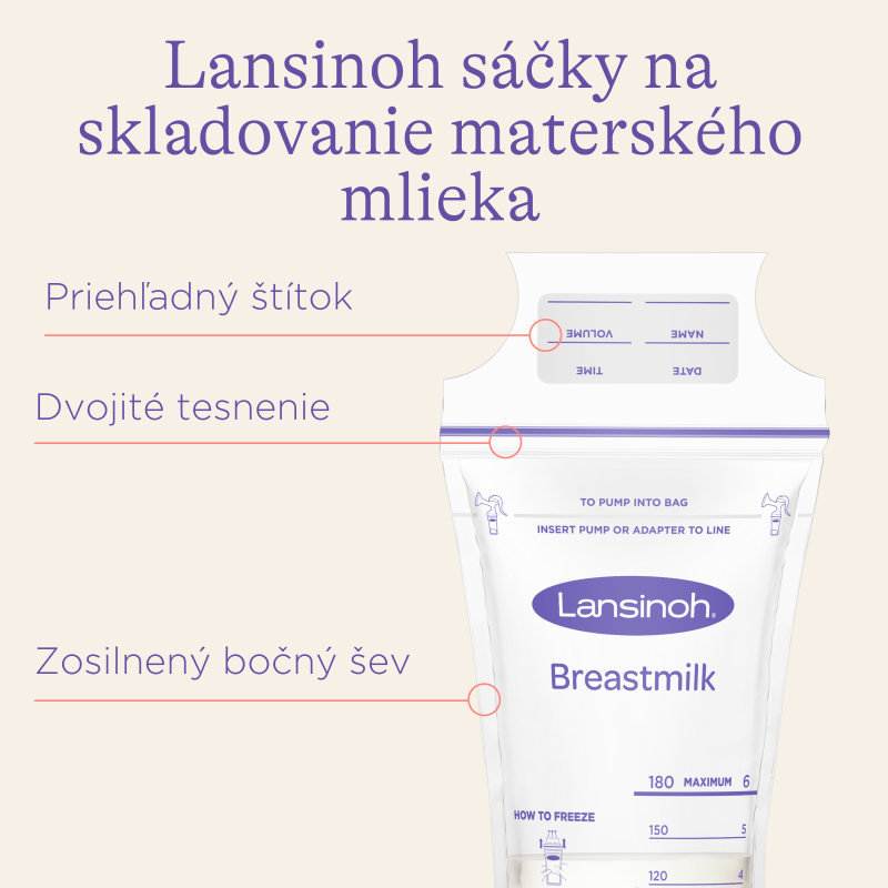 Lansinoh sáčky na uskladnenie materského mlieka boli vyrobené špeciálne pre mrazničky, ale môžu sa používať aj na uskladnenie materského mlieka v chladničke. Špeciálny výrobný proces umožňuje vyrábať tieto zdravotnícke sáčky bez použitia zmäkčovadiel, a tak látky, ktoré by mohli byť škodlivé pre vaše dieťa, nebudú vnikať do vášho materského mlieka.