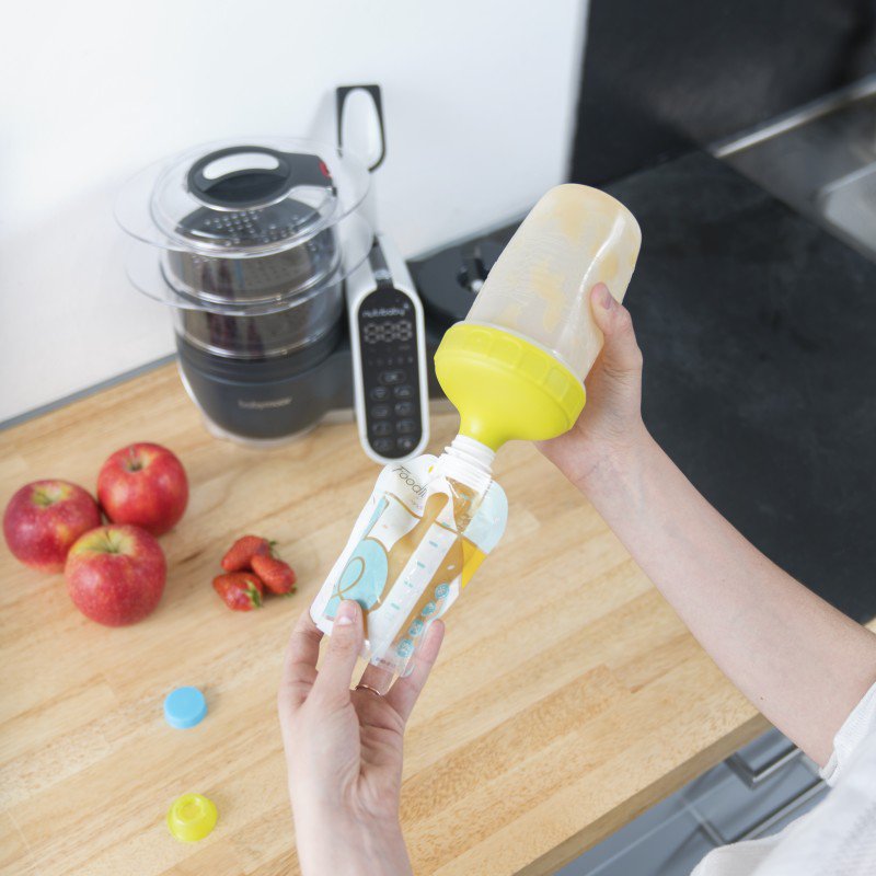 - pre naplnenie vrecka obľúbeným jedlom odporúčame zakúpiť Starovní sadu Foodii Starter Kit, ktorá obsahuje Squeeze Snack Filler™