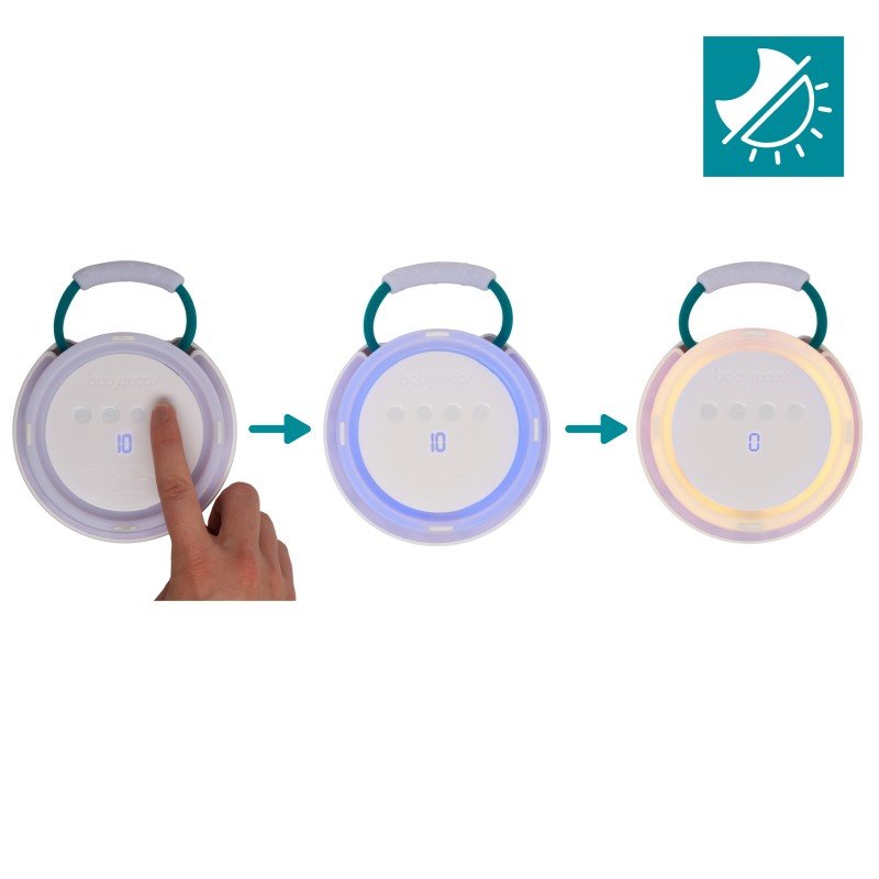 10 minút pred prebudením, kedy má skončiť Vami nastavená doba spánku, zmení lampička farbu. Do miestnosti začne rozptyľovať teplú žltú farbu. Táto reprodukcia východu slnka pomôže Vášmu dieťaťu sa pokojnejšie prebudiť. Dieťa si rýchlo spojí farby svetla a dennej doby, modré svetlo sa spánkom a žlté svetlo so vstávaním.