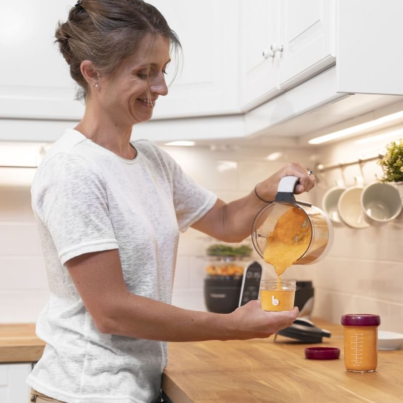 Babymoov skladovací misky majú objem 100ml a 220ml. Majú viečko so skrutkovacím uzáverom a hermetickým, silikónovým tesnením. Na stene misiek je stupnica (v ml a oz) a na vrchnej strane viečok je prepisovateľný povrch, kde si môžete jednoducho poznamenať uvarený pokrm a dátum, kedy bol pripravený.