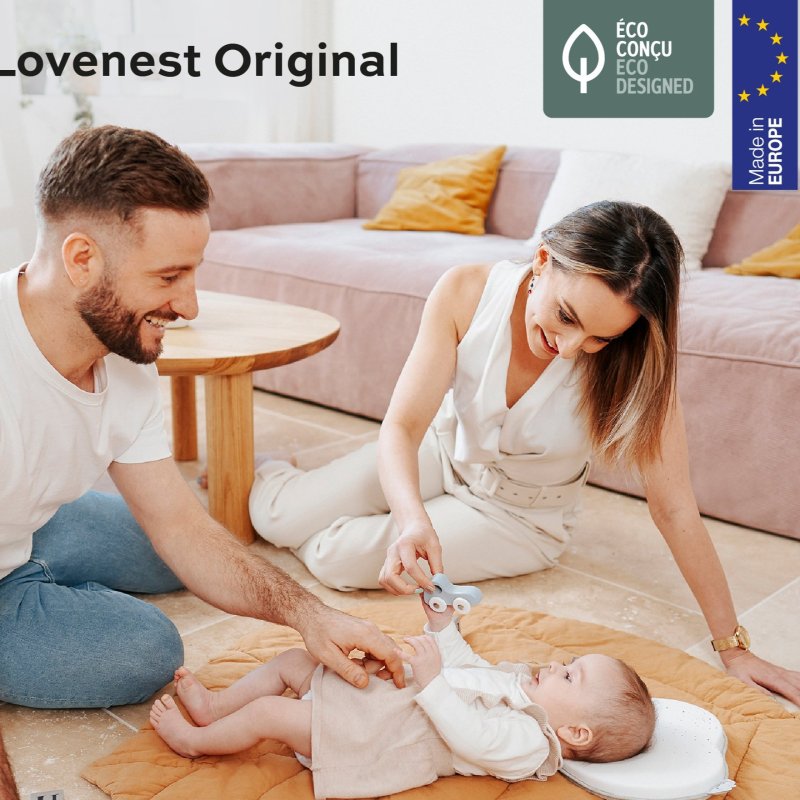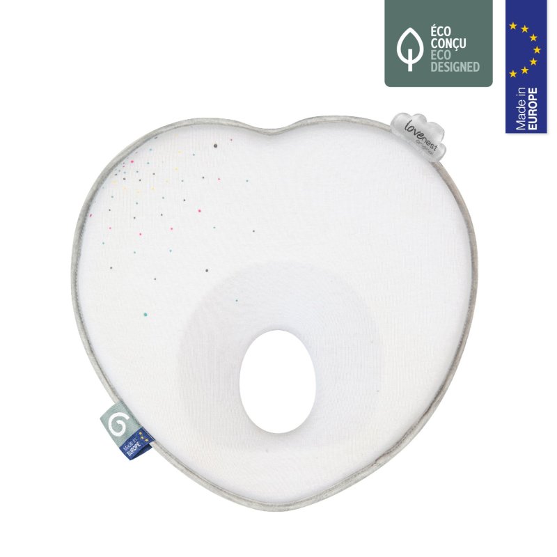 Podhlavníček LoveNest bol patentovaný a je vyrábaný v Portugalsku. Je špeciálne tvarovaný tak, aby vyhovoval tvaru lebky dojčatá a zaisťoval rovnomerné rozloženie tlaku po hlavičke a zároveň umožňoval úplnú voľnosť pohybu.