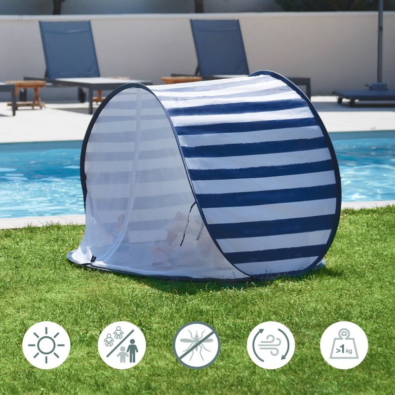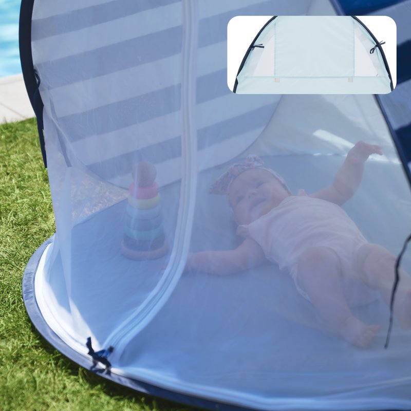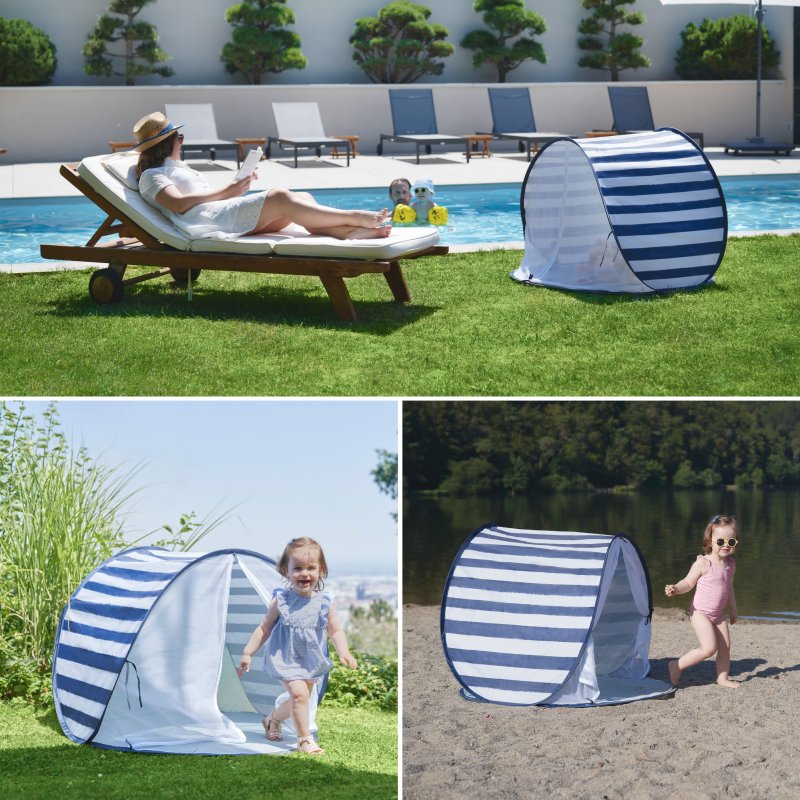 Stan sa ľahko zostavuje a skladá vďaka pop-up systému, je dostatočne veľký aj pre 2 deti. Má veľký otvor vpredu a dve ventilačné okienka vzadu pre optimálnu cirkuláciu vzduchu. Sieťkou v prednej časti možno celý stan uzavrieť, čím vytvoríte ochranu pred hmyzom počas leta. Dno stanu je nepriepustné. Tento plážový stan je dodávaný so 4 kolíky pre upevnenie. Stan je veľmi ľahký (<1 kg) a ľahko sa prenáša v taške s pútkami, ktorá je súčasťou.