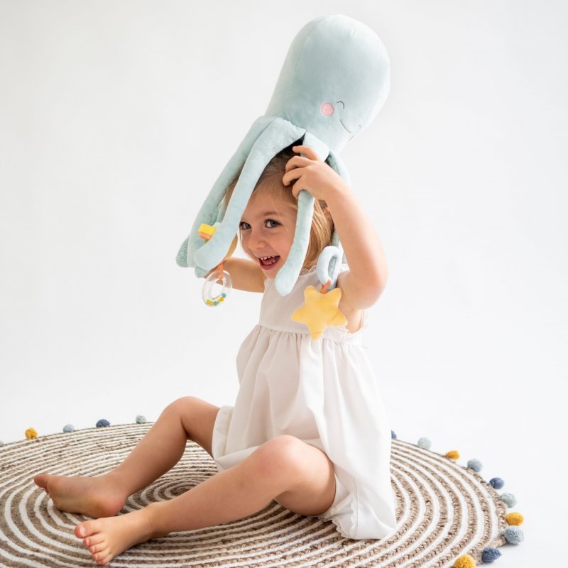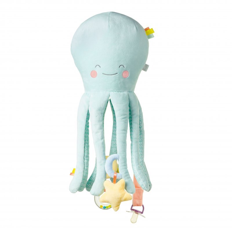 - na chápadlách je umiestnené hrkálka, pískatko, farebné saténové stužky, pútko na cumlík