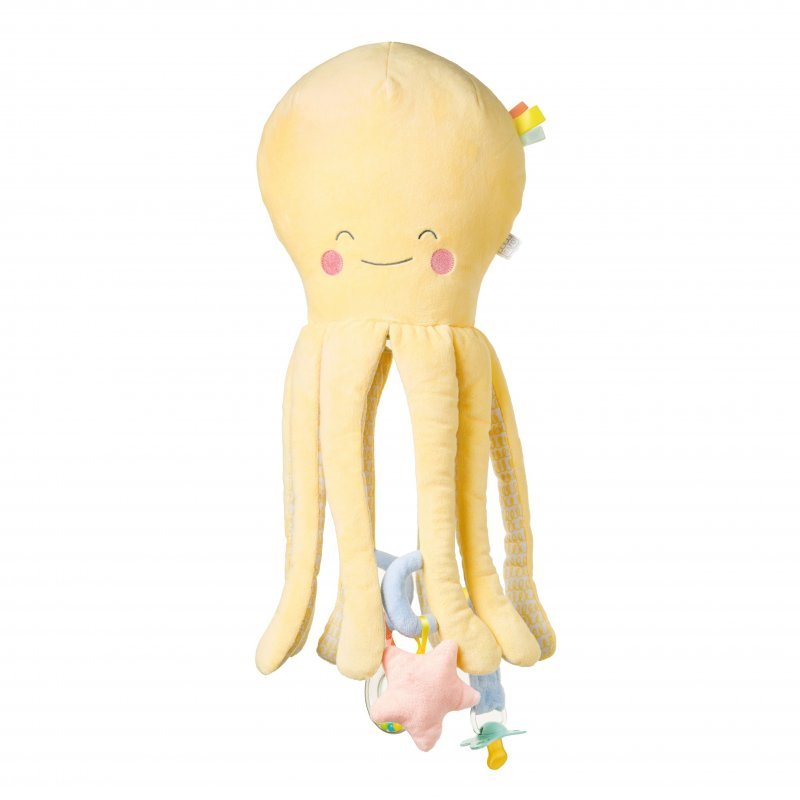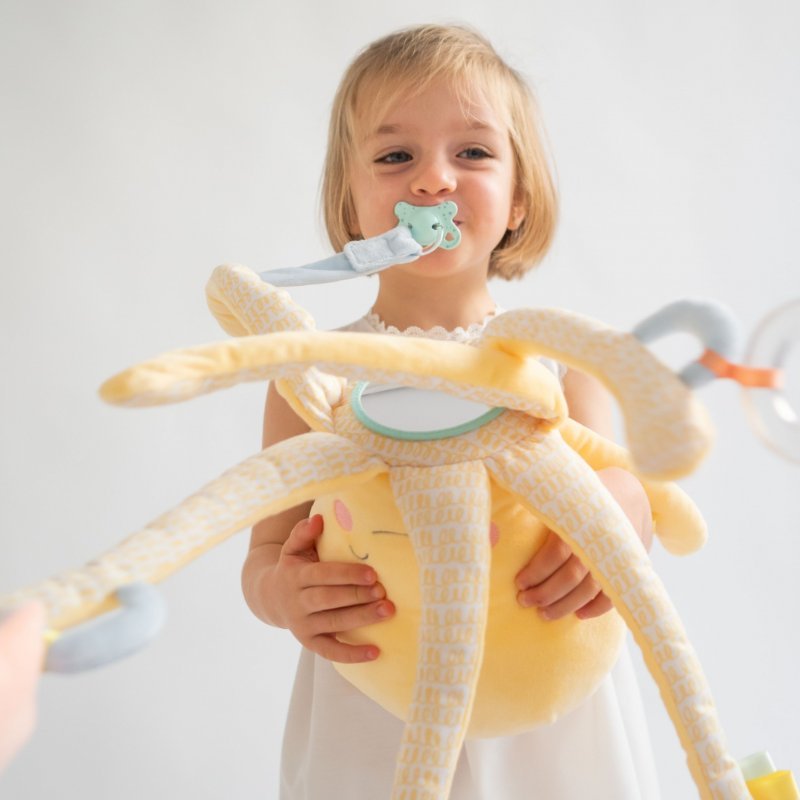 - na chápadlách je umiestnené hrkálka, pískatko, farebné saténové stužky, pútko na cumlík