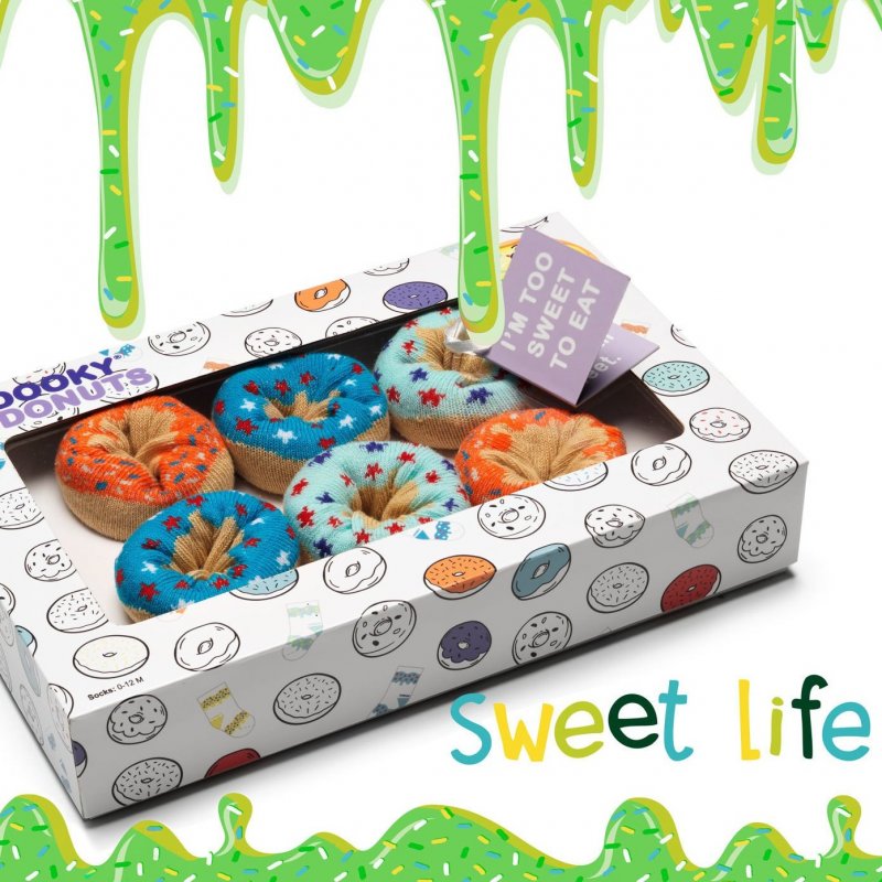 Dooky Donuts ponožky sú jednoducho tá najsladšia vec! S 3 pármi chutne vyzerajúcich ponožiek bude každej detskej nožičke dopriate pohodlie, teplo a štýl! Sú zrolované ako báječné donutky a navyše zabalené v krásnej darčekovej krabičke! Prajeme vám dobrú chuť.