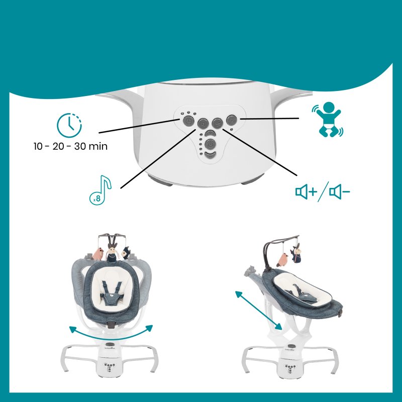 - nastaviteľná doba hojdania (10-20-30 minút) a nastaviteľná hlasitosť