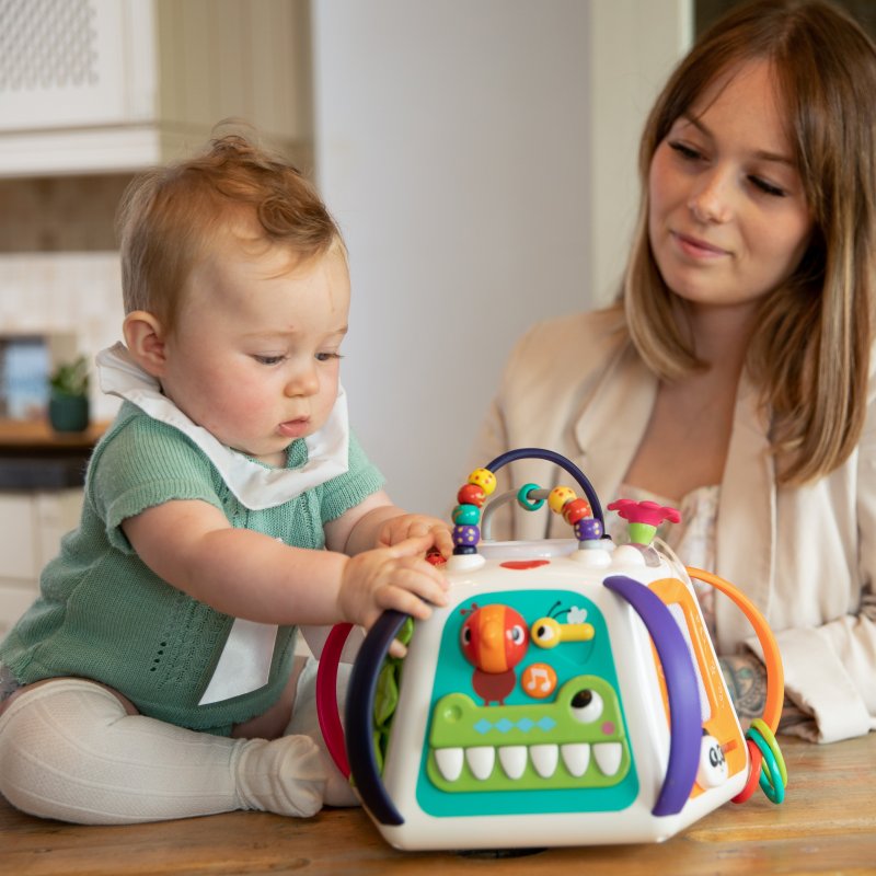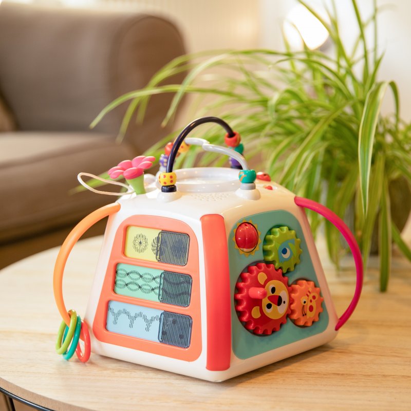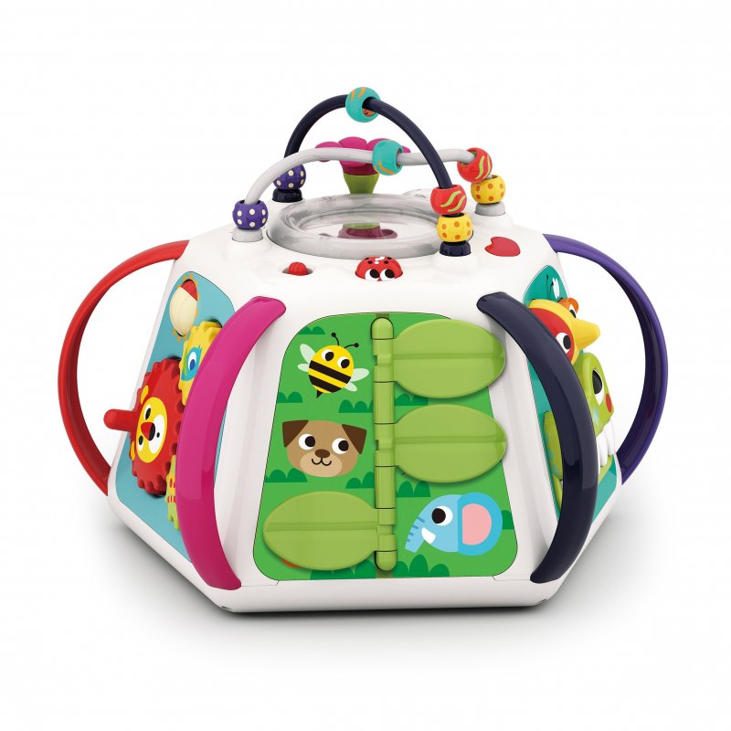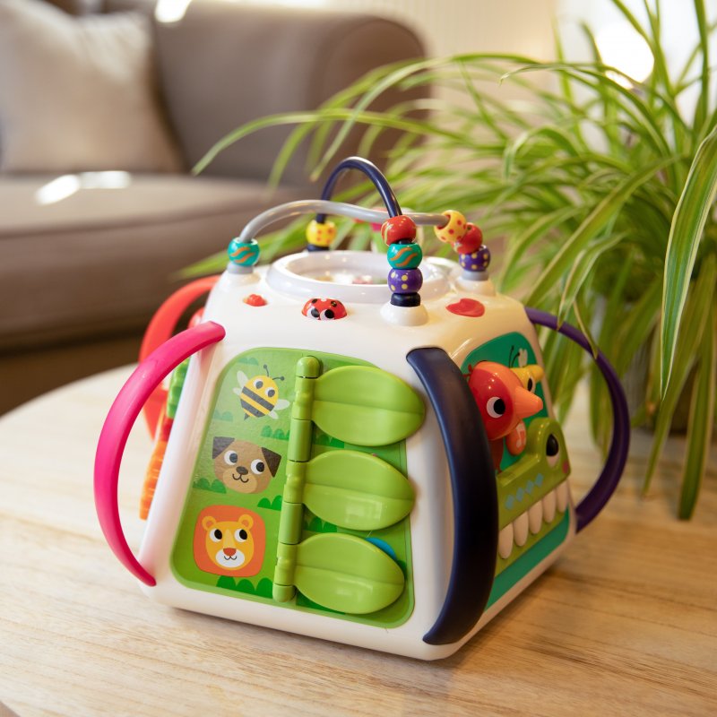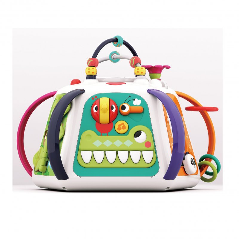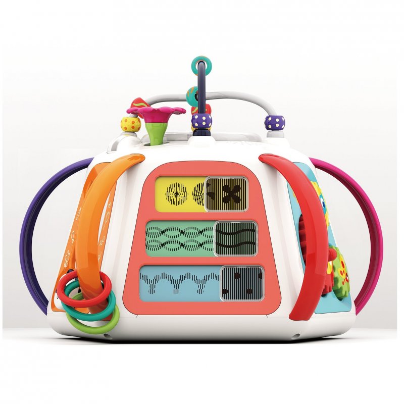 - plastová pyramída s mnohými aktivitami - labyrint s korálkami, zrkadlo, kresliaca tabuľka, ozubené kolieska, úchyty s LED osvetlením, hudobné tlačidlá, rotujúce valček s farebnými guličkami, pohyblivé vzory, hra so zvieratkami ai.
