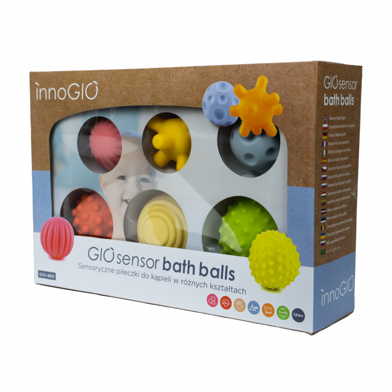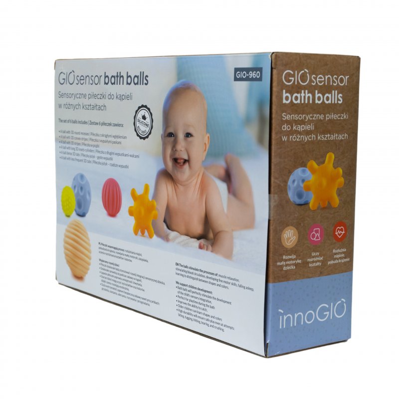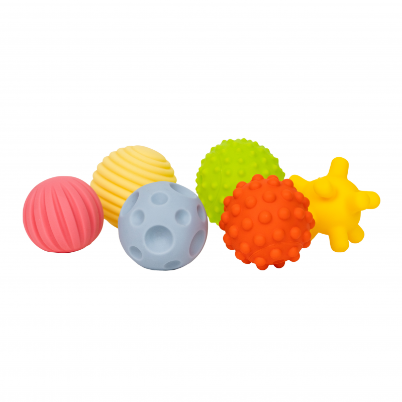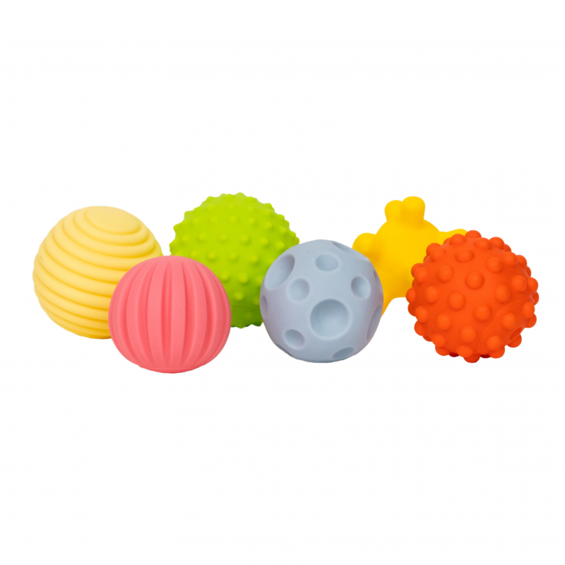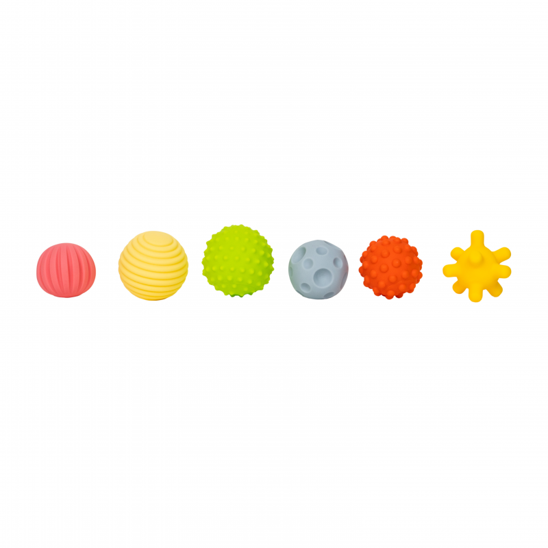 Sada 6 mäkkých loptičiek rôznych farieb, ktoré podporujú zmysly dieťatka. Každá loptička má inú textúru, vďaka čomu podporujú detskú fantáziu a poskytujú nové zmyslové dojmy. Senzorické loptičky sú skvelé aj pre masáž bábätiek, ktorá uvoľňuje svalové napätie batoľaťa. Loptičky sú určené aj na zábavu pri kúpaní.
