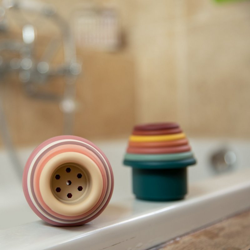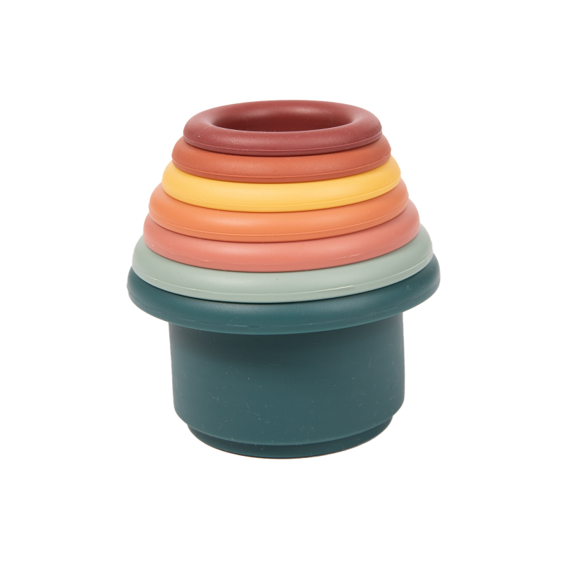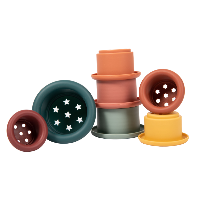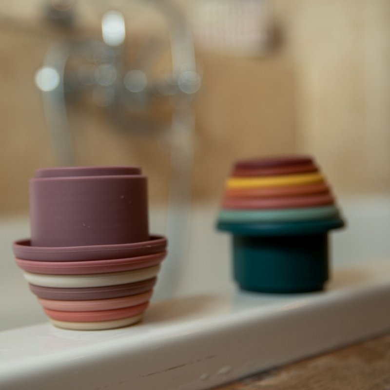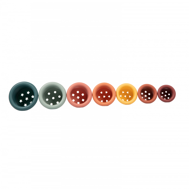 Silikónové stohovacie kalíšky rôznych veľkostí a farieb.