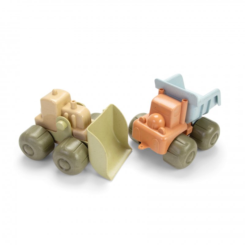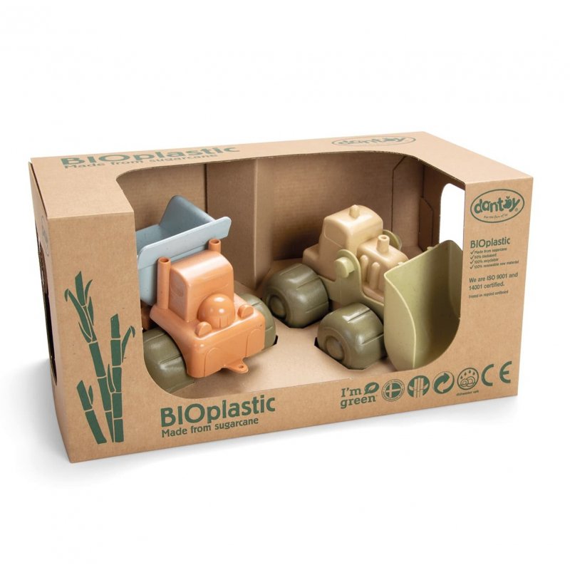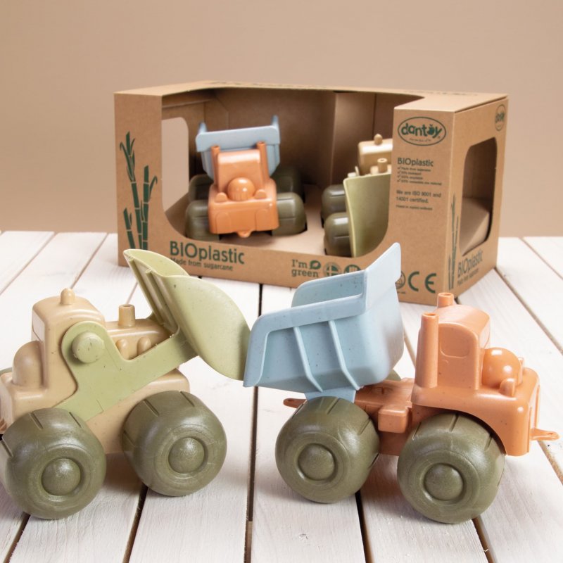 • sada 2 vozidiel - nákladné autíčko a bagrík - vyrobené z bioplastu - z cukrovej trstiny