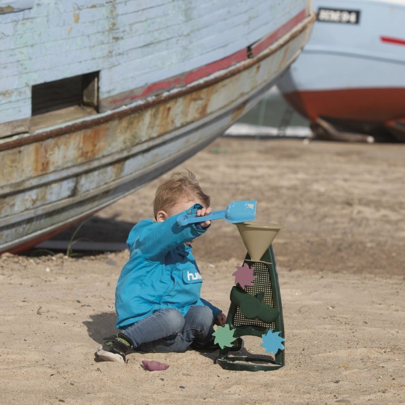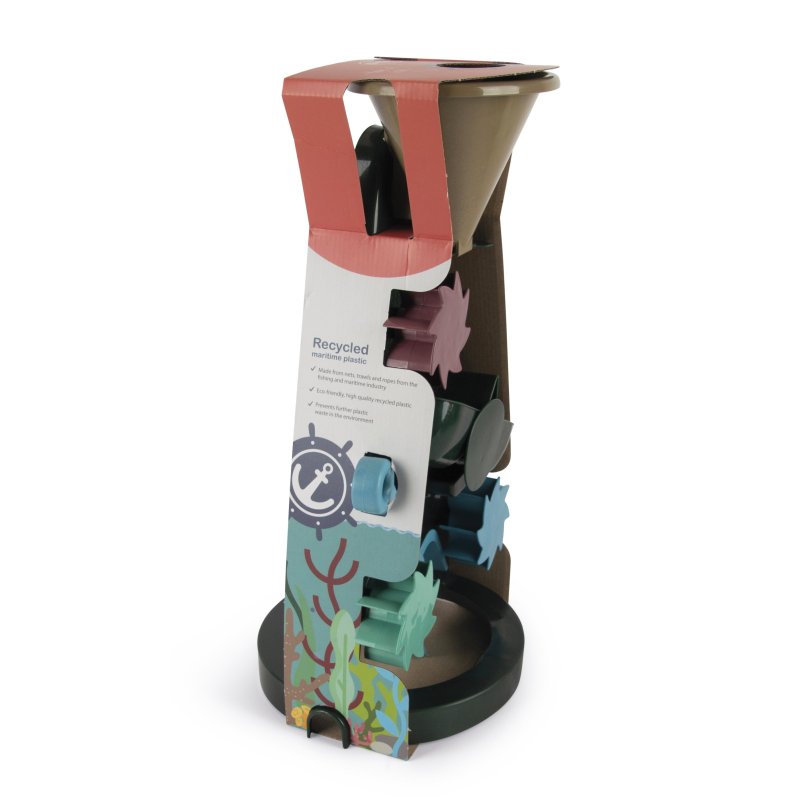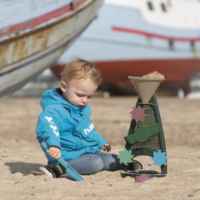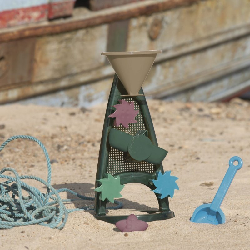 Krásna sada s lopatkou, bábovičkou a veľkým mlynom, ktorým "preteká" piesok aj voda. Súprava poskytuje mnoho príležitostí pre zmyslovú hru a poznávanie prírody na pláži alebo v pieskovisku a posilňuje jemnú detskú motoriku a koordináciu očí a rúk. Hračka je vyrobená z recyklovaného rybárskeho a námorného vybavenia (zo sietí a lán, ktoré by inak skončili na dne oceánu).