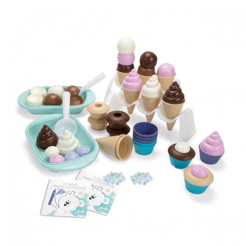 Krásna, veľká dezertná sada obsahujúca zmrzlinové kornúty, kopčeky zmrzliny, zákusky a ďalšie ozdobné doplnky. V priloženom stojane môžete pripravovať rôzne druhy zmrzlín a tort v nekonečných kombináciách a krásne ich aranžovať. Súčasťou sú aj pekné omaľovánky, v ktorých si môžete vyfarbiť kúzelný svet medvedíka Thorbjorna a jeho priateľov. Táto sada nabáda k hre a učeniu a je ideálna pre vnútorné aj vonkajšie použitie.