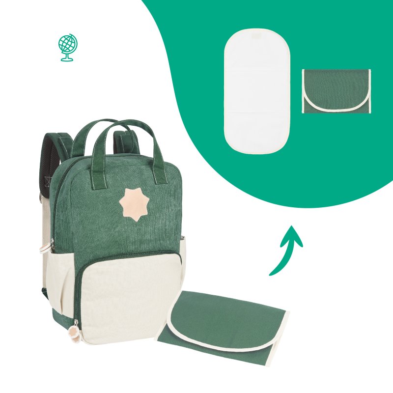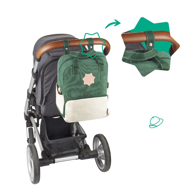 Batoh Safari má prirodzený vzhľad s jemnými farbami, bavlneným plátnom a manšestrom. Vďaka veľkej úložnej kapacite a mnohým úložným priehradkám je možné do neho zabaliť všetko, čo je potrebné a rýchlo to nájsť! Jeho dvojité otváranie umožňuje ľahký prístup k obsahu tašky zhora aj spredu. Dá sa pripevniť aj na kočík. Bonus navyše: súčasťou je prebaľovacia podložka!