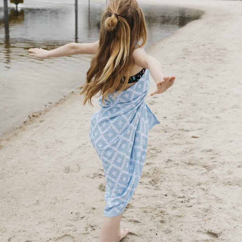 , ktorú je možné použiť po kúpeli, pri bazéne, na pláži... Tento materiál dobre absorbuje vlhkosť, ale zároveň tiež rýchlo schne. Trendy design!