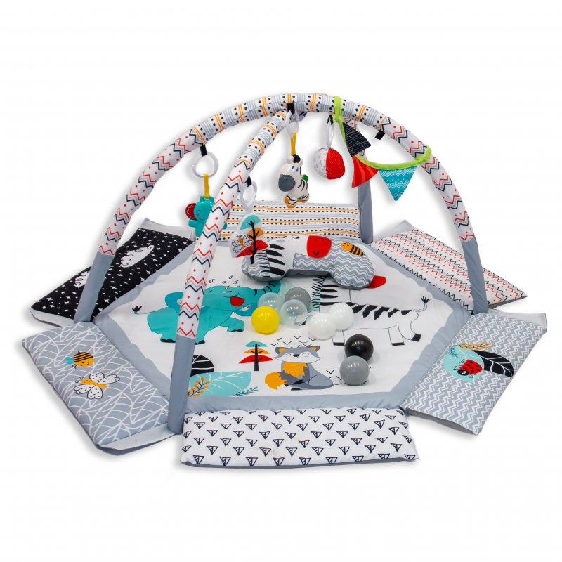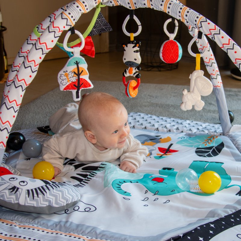 - na hrazdičke je zavesených 5 hračiek s rôznymi aktivitami - je možné ich zložiť a zameniť za iné