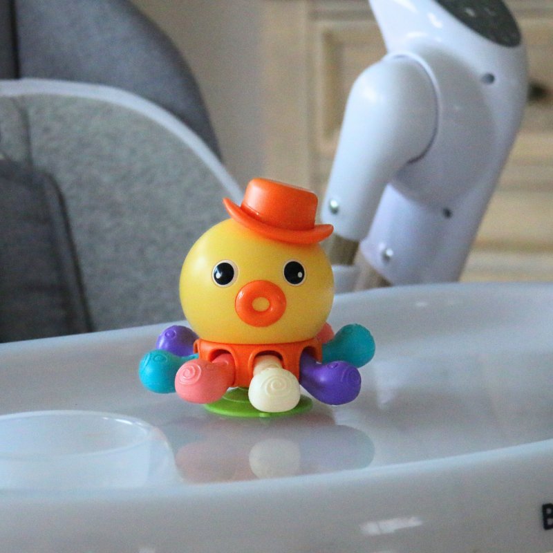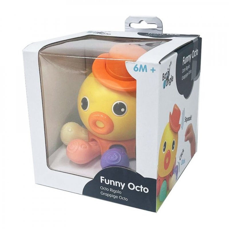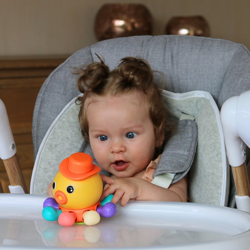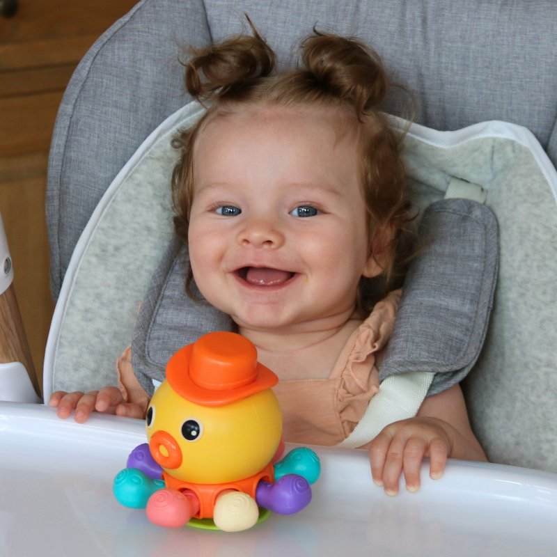 Veselá chobotnička pre malých prieskumníkov a objaviteľov! Len si predstavte, ako sa rozžiari očíčka dieťaťa, keď objavia, že môže točiť hlavou chobotnice o úplných 360°! A to nie je všetko - keď stlačí jedno z jej chápadiel, začuje zábavné zvuky, ktoré rozosmejú celú miestnosť. Navyše, každé chápadlo cvakne, keď ho uvoľní, čo je skvelá funkcia pre rozvíjanie hmatových zručností a koordinácia ruky a oka. Chobotnička je ideálna hračka na podporu a rozvoj aktívneho myslenia dieťatka. Každá interakcia s touto hračkou poskytuje príležitosť na učenie a objavovanie. Prísavka na spodnej strane umožňuje pripevniť chobotničku na hladký povrch pre ešte väčšiu zábavu!