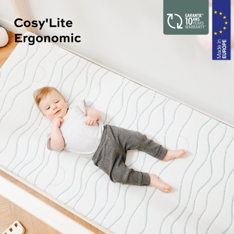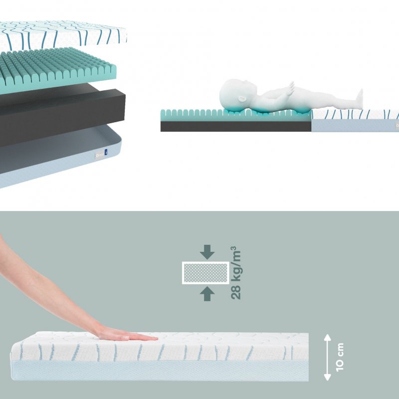 - výplň tvoria 2 typy peny: vonkajšia, bublinková s hustotou 28kg/m3 + vnútorná s hustotou 30kg/m3 - to zaručuje, že sa bábätko do matraca nezaborí