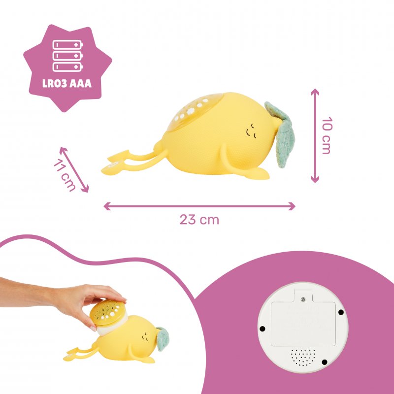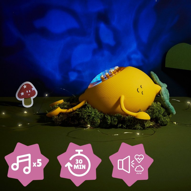Zoznámte sa s Basileom: nočným projektorom v tvare citrónu, ktorý sa stane novým najlepším priateľom dieťatka pred spaním alebo zdriemnutím. Na stenu premieta lístky a prehráva ukľudňujúce melódie a zvuky prírody, aby pomohol dieťatku lepšie zaspať.