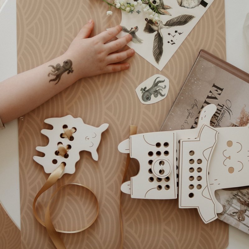 Drevená provliekacia hračka rozvíjajúca kreativitu a predstavivosť. Provliekanie zvieratiek šnúrkami predstavuje nielen radostný spôsob zábavy, ale zároveň napomáha v príprave detí na písanie v škole. Rozvíja manuálnu zručnosť a jemnú motoriku. Tréning koordinácia oko-ruka podporuje jazykové zručnosti a vytváranie nových nervových spojení v mozgu. Na začiatok dobrodružstva s provliekaním odporúčame menšiu verziu, aby ste mohli lepšie posúdiť, v ktorej fáze vývoja jemnej motoriky sa vaše dieťa nachádza, a následne prejsť k väčšej verzii.
