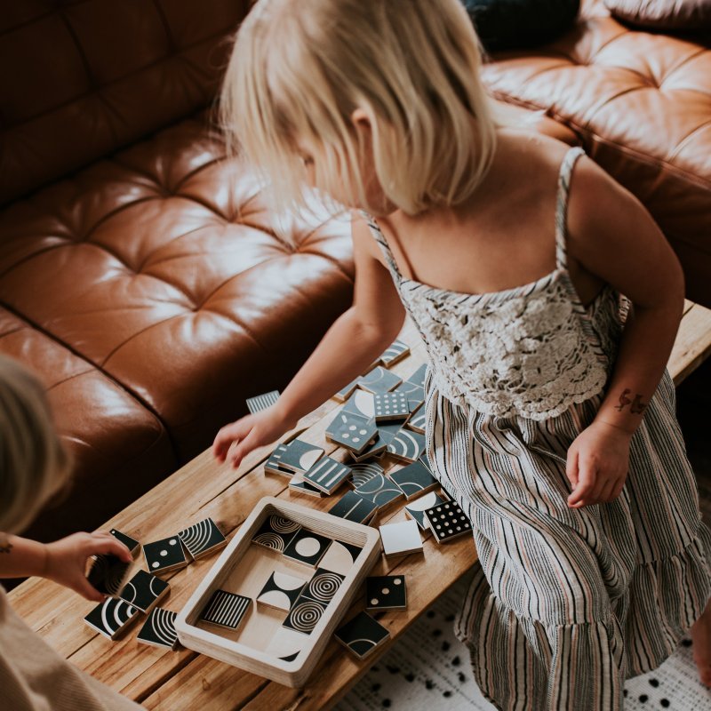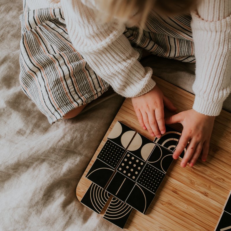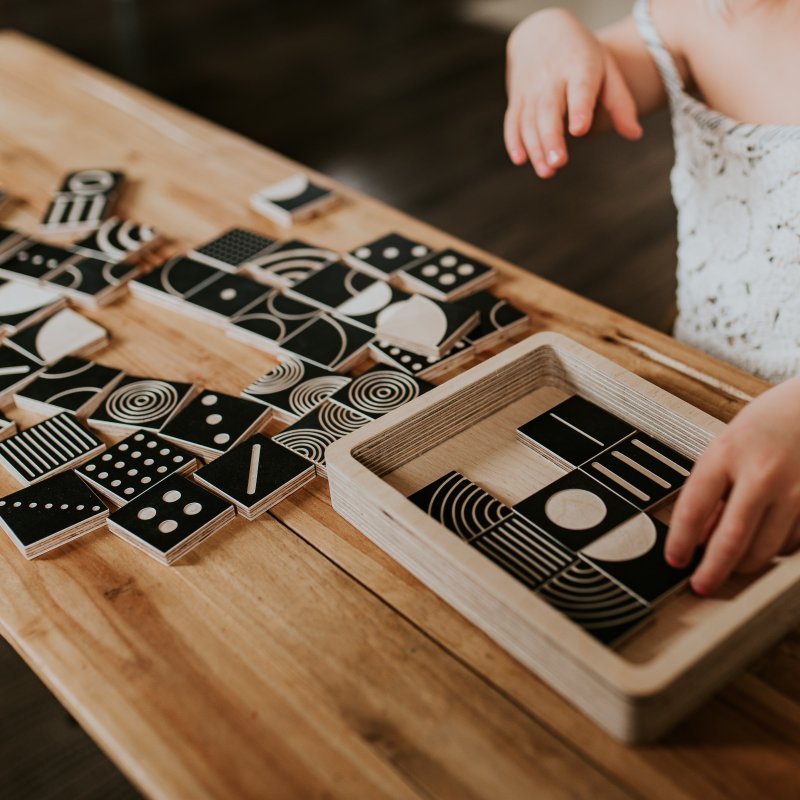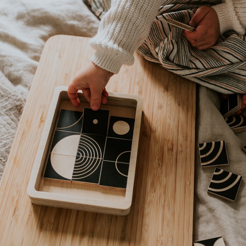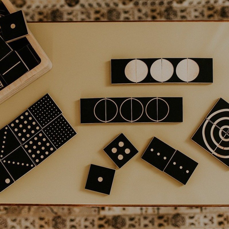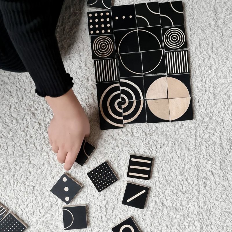 Sada obsahujúca 60ks drevených kociek + 28ks kariet s kompozíciami, ktoré slúžia ako vzor na skladanie. V prvých mesiacoch života sa dieťa dokáže sústrediť asi 10 sekúnd, tým, že mu poskytujeme kontrastné obrázky, vzbudzujeme jeho zvedavosť, pozornosť sa potom predlžuje na 90 sekúnd, čo prispieva k vytváraniu nových nervových spojení v mozgu! Najlepšie je ukázať také hračky dieťaťu od prvých dní života.