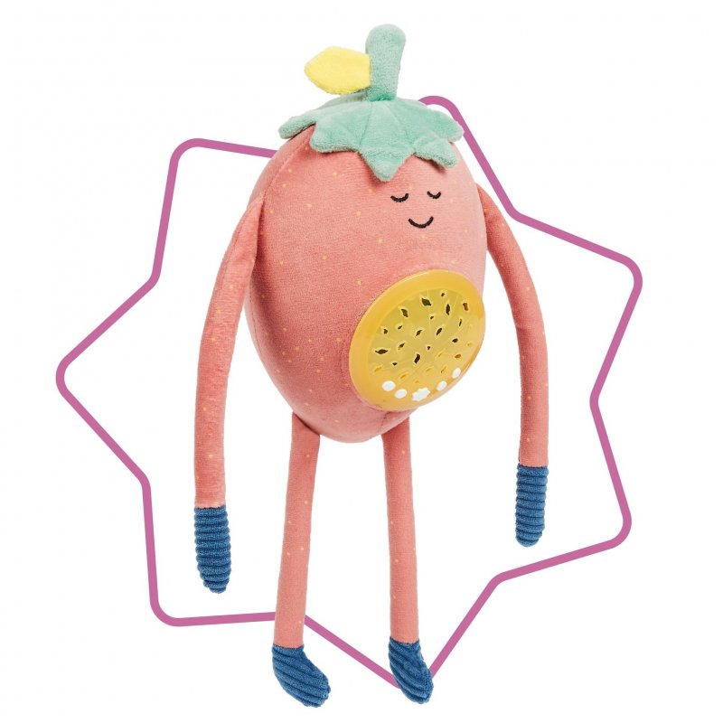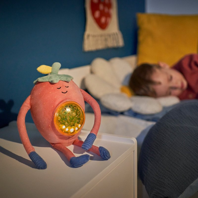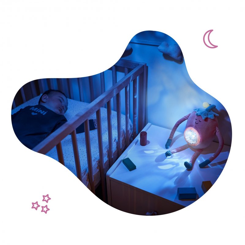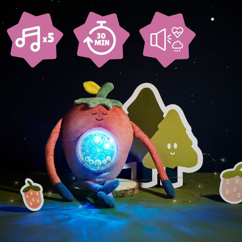 Zoznámte sa s Barnabéom: nočným projektorom v tvare jahôdky, ktorý sa stane novým najlepším priateľom dieťatka pred spaním alebo zdriemnutím. Na stenu premieta lístky a prehráva ukľudňujúce melódie a zvuky prírody, aby pomohol dieťatku lepšie zaspať.