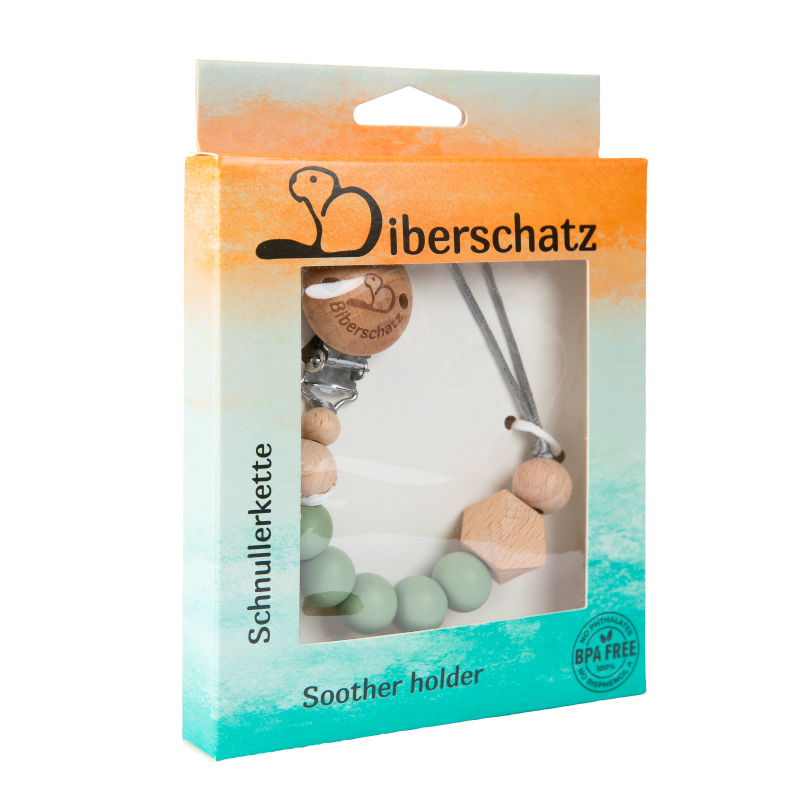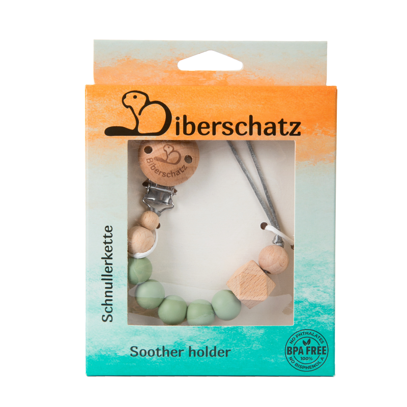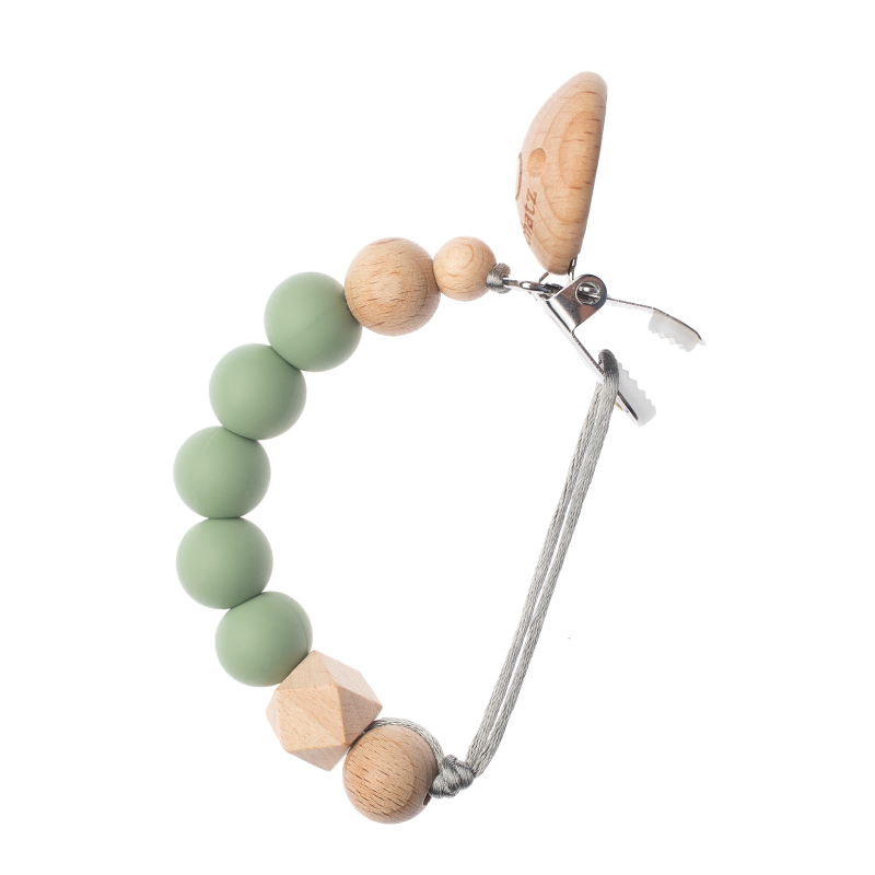 • vyrobený zo 100% hypoalergénneho silikónu, bukového dreva, saténovej šnúrky a kovového klipu