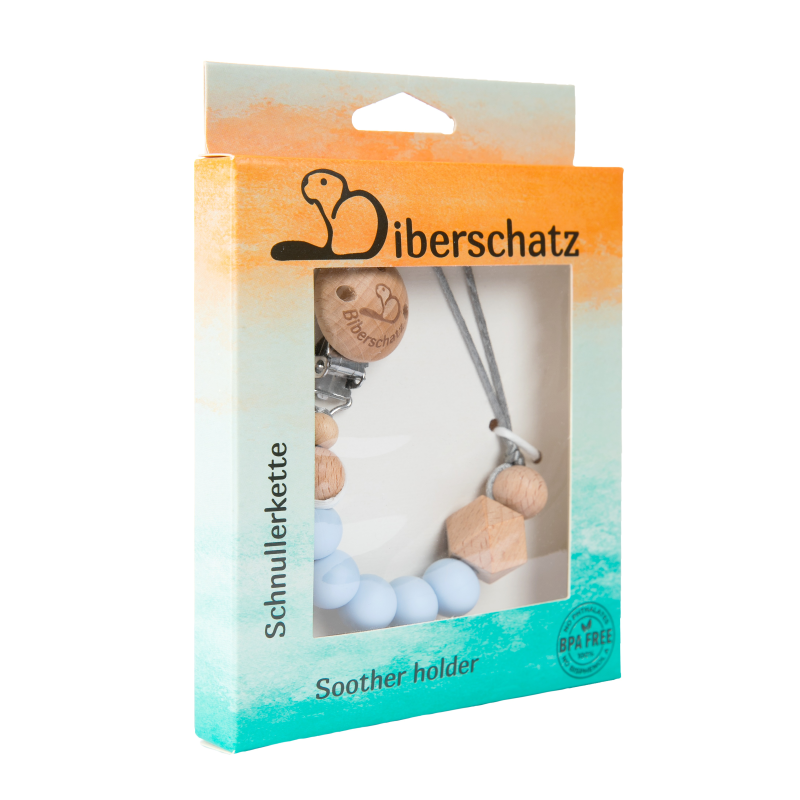 - vyrobený zo 100% hypoalergénneho silikónu, bukového dreva, saténovej šnúrky a kovového klipu