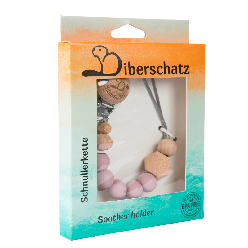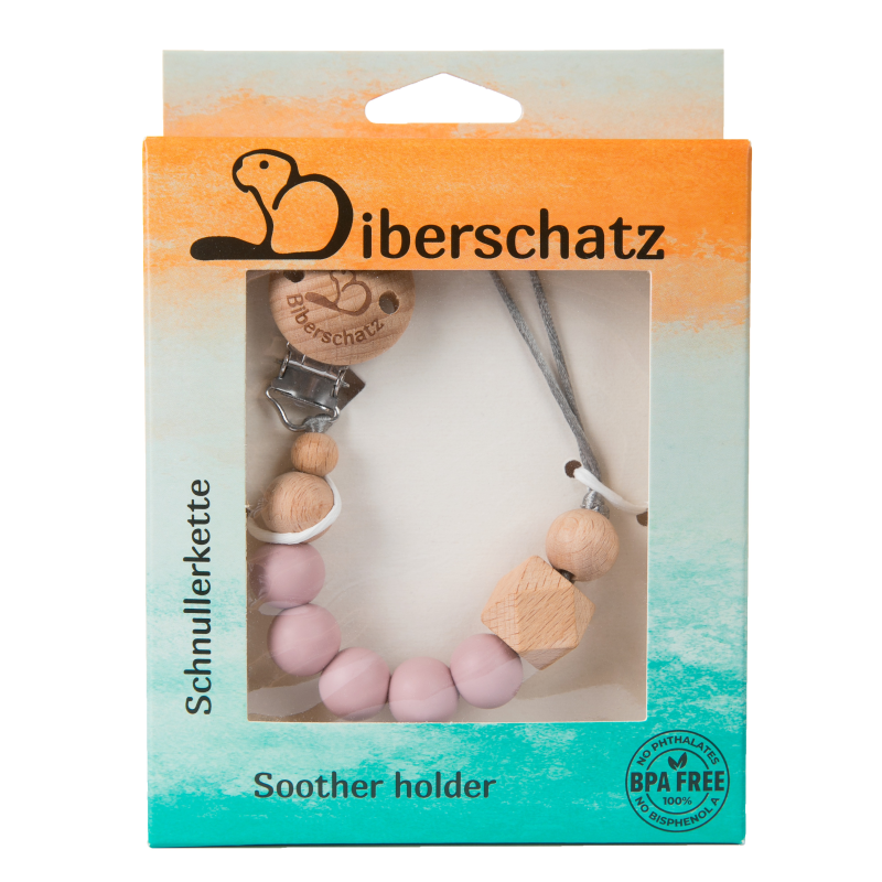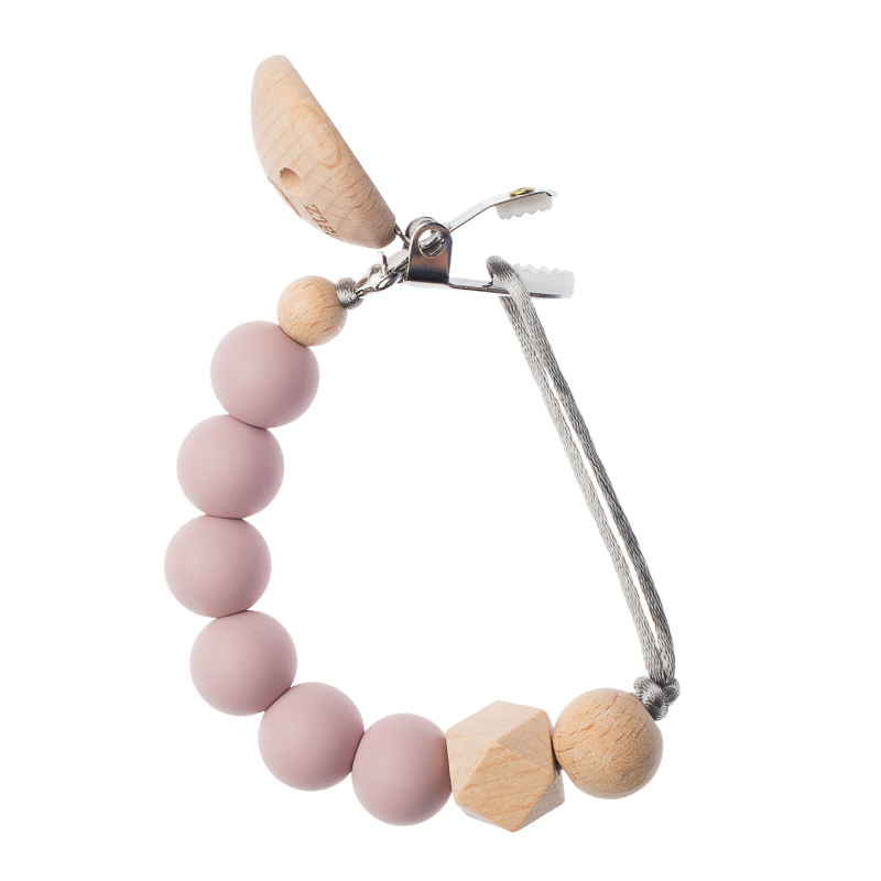 • vyrobený zo 100% hypoalergénneho silikónu, bukového dreva, saténovej šnúrky a kovového klipu