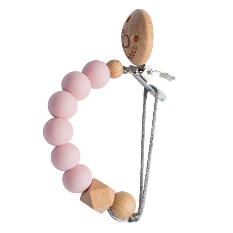 • vyrobený zo 100% hypoalergénneho silikónu, bukového dreva, saténovej šnúrky a kovového klipu