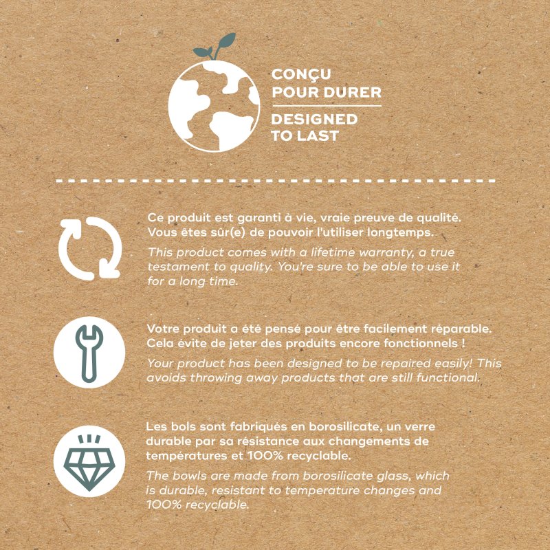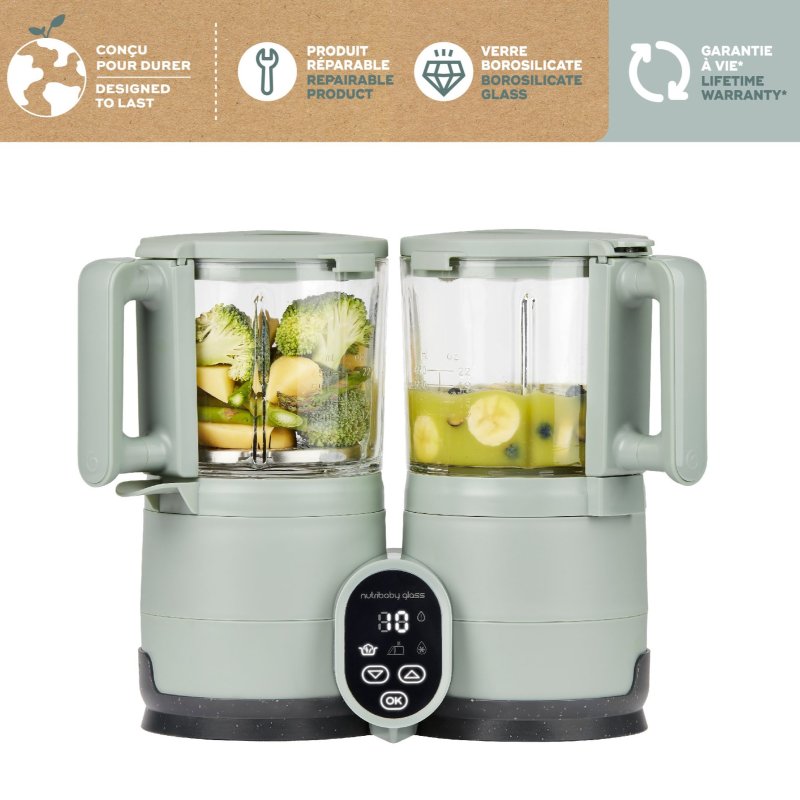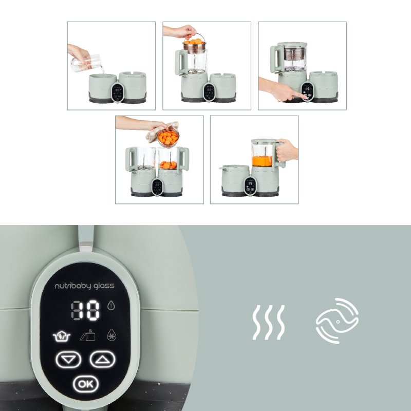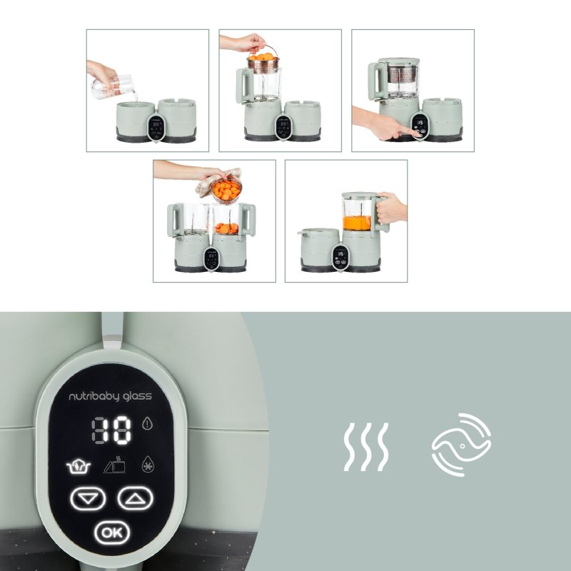 Predstavujeme náš kuchynský prístroj pre zdravé jedlá s ekologickým dizajnom: Nutribaby Glass! So svojimi sklenenými varnými a mixovacími miskami a nerezovým košom je tento eko-designovaný prístroj ideálny pre všetky fázy vývoja dieťaťa. Možno v ňom variť a mixovať súčasne. Nutribaby Glass má celkovú kapacitu 1900ml (1300ml na varenie a 600ml na mixovanie). Vhodný na varenie všetkých druhov potravín: ovocie a zelenina, mäso, ryby, vajcia, obilniny, atď. Nutribaby Glas = úspora času pre nových rodičov, ktorí chcú dopriať svojim deťom zdravé a chutné domáce jedlá!