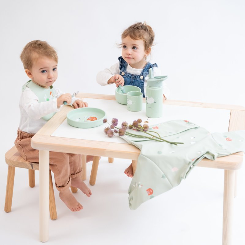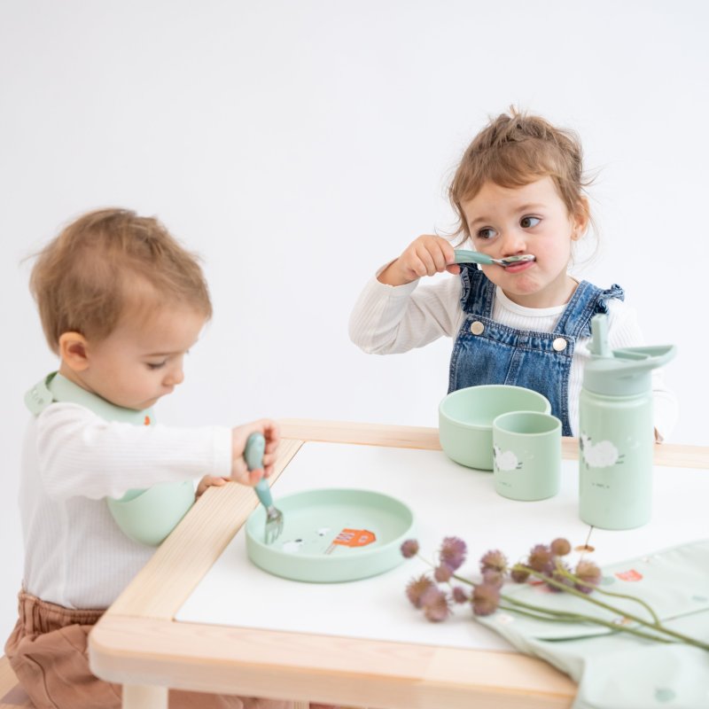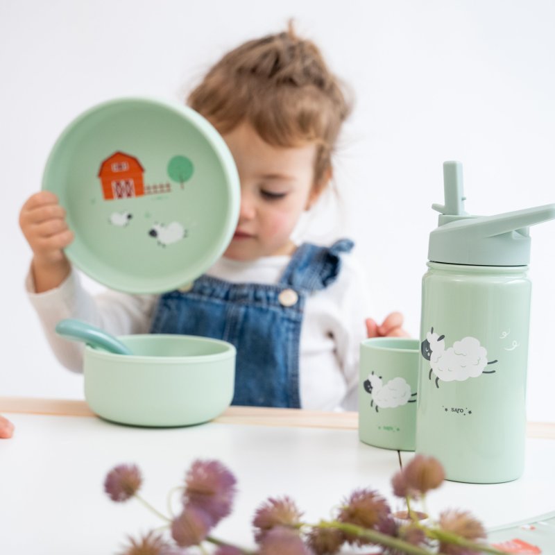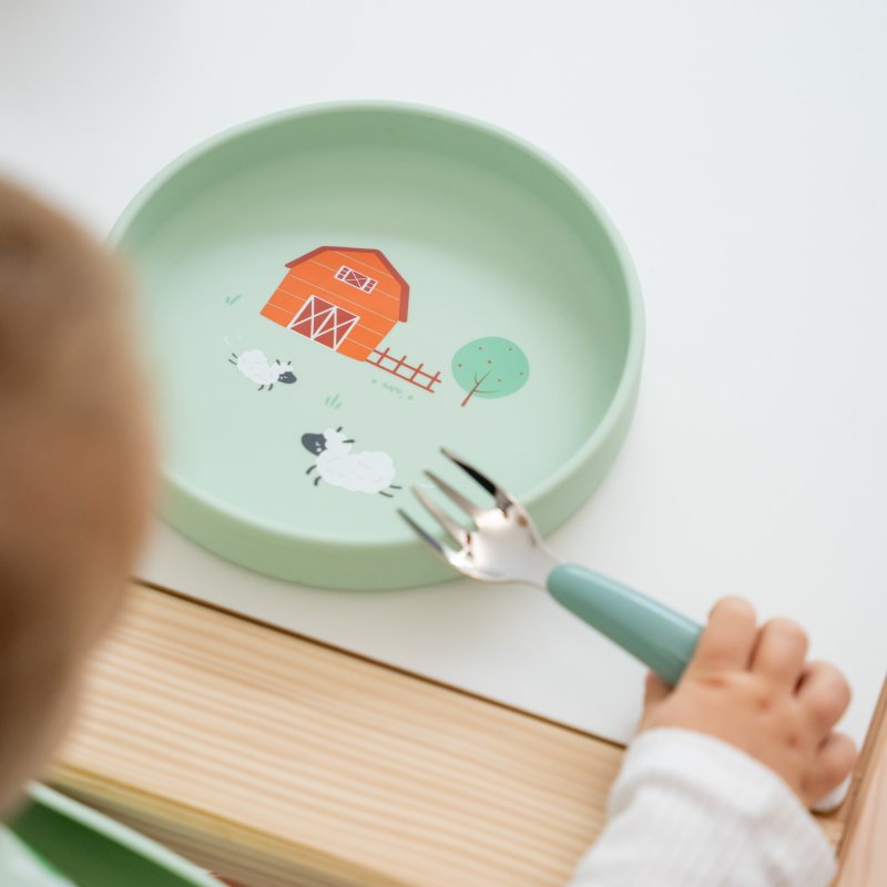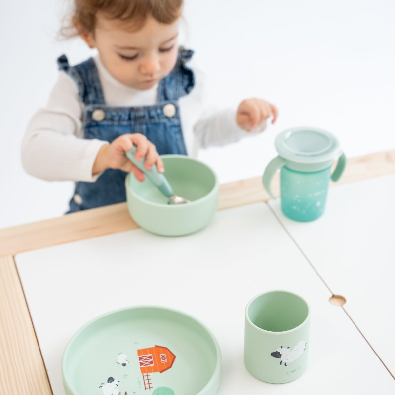 Prebuďte vo svojom dieťatku prirodzenú zvedavosť naučiť sa jesť samo s touto silikónovou sadou so zábavnými obrázkami zvieratiek.