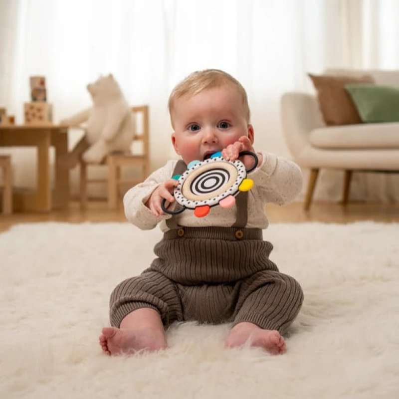 - na zadnej strane zrkadla je čiernobiely terč na zdokonalenie sústredenia a podporu zrakového vývoja bábätka