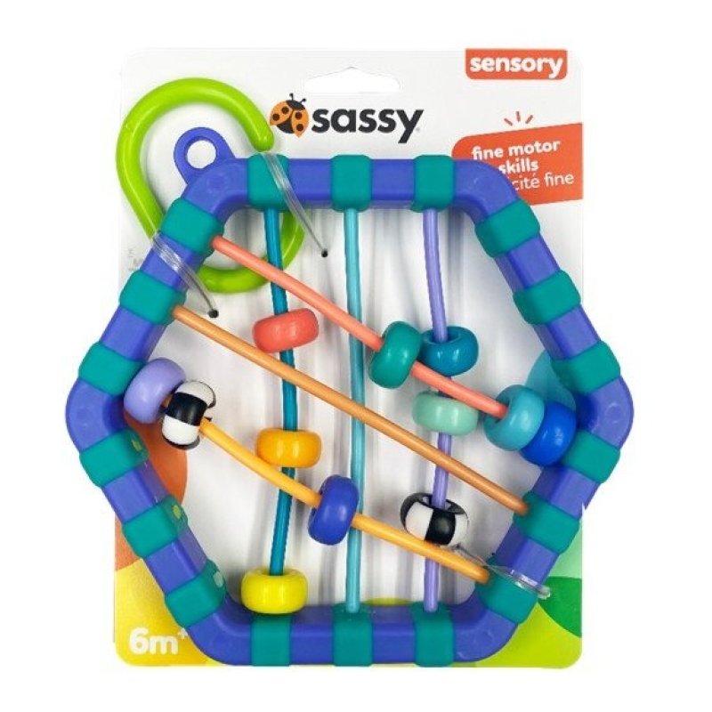 Plastový šesťuholník s pružnými pásikmi a živými farebnými korálkami je skvelým pomocníkom pre rozvoj jemnej motoriky. Umožňuje deťom trénovať pohyb prstíkov, objavovať a pomenovávať rôzne farby, čím sa podporí ich kreativita aj jazykový rozvoj. Navyše unikátna textúra okrajov funguje ako bezpečné hryzátko, ktoré zmierni nepríjemné pocity pri prerezávaní prvých zúbkov.